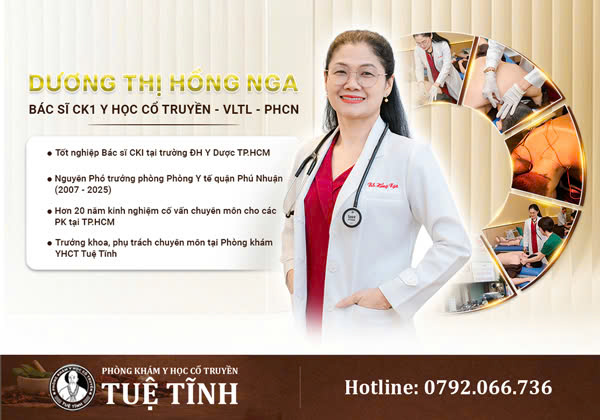 Phòng khám Y học cổ truyền Tuệ Tĩnh là địa chỉ đáng tham khảo, nơi bác sĩ CKI Dương Thị Hồng Nga trực tiếp thăm khám và điều trị. Bác sĩ tốt nghiệp Đại học Y Dược TP.HCM, chuyên ngành Y học cổ truyền kết hợp Vật lý trị liệu – Phục hồi chức năng.