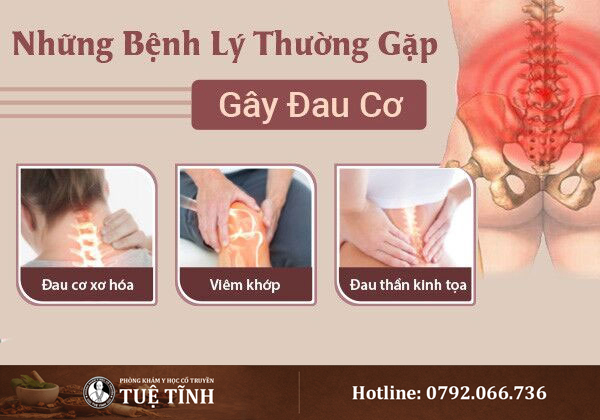 Đa số trường hợp đau cơ xuất phát từ tổn thương cơ xương do nhiều bệnh lý khác nhau. Có thể kể đến như: đau cơ xơ hóa gây đau toàn thân kèm mệt mỏi, rối loạn giấc ngủ; viêm khớp khiến cơ co thắt bảo vệ và gây đau; viêm dây thần kinh làm căng cơ, tê bì, chuột rút; đau thần kinh tọa với triệu chứng đau lan từ thắt lưng xuống chân; hoặc căng cơ do vận động quá sức, tai nạn khiến sợi cơ bị giãn quá mức.