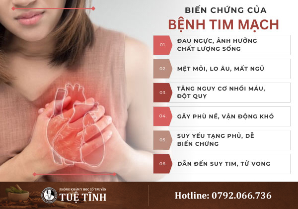 Bệnh tim mạch không chỉ gây rối loạn khí huyết mà còn ảnh hưởng toàn thân. Nếu không điều trị kịp thời, bệnh tiến triển nặng sẽ để lại nhiều hệ lụy nguy hiểm như: