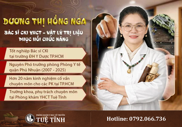 Nổi bật trong đội ngũ y bác sĩ của phòng khám phải kể đến Bác sĩ chuyên khoa Dương Thị Hồng Nga. Đây là người trực tiếp phụ trách kỹ thuật chuyên môn tại Phòng khám Y học cổ truyền Tuệ Tĩnh. Bác sĩ Hồng Nga tốt nghiệp Đại học Y Dược TP Hồ Chí Minh, và công tác tại nhiều đơn vị y tế lớn. Y đức của bác sĩ đã được công nhận bằng các Bằng khen/ Giấy khen, những đóng góp tích cực cho ngành y trong thời điểm dịch bệnh,…