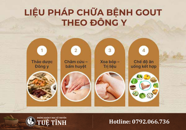 Sử dụng các bài thuốc có tác dụng thanh nhiệt, giải độc, lợi niệu, khu phong thấp. Từ đó giảm sưng đau và hỗ trợ đào thải acid uric.