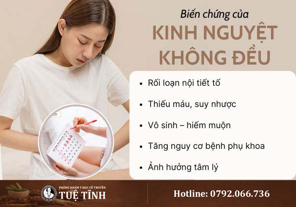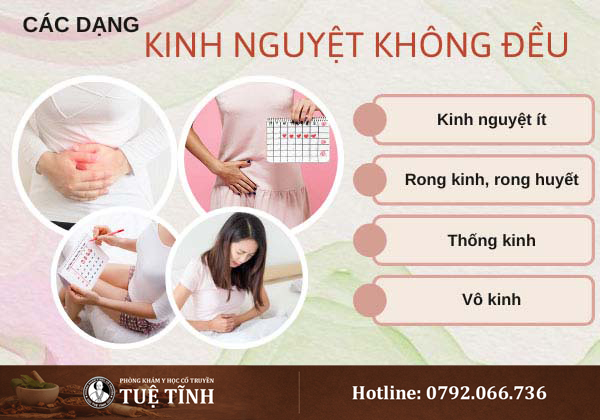 Kinh nguyệt không đều là tình trạng chu kỳ thay đổi thất thường, có khi đến sớm, có khi trễ, lượng máu không ổn định hoặc màu sắc khác thường. Một số biểu hiện phổ biến bao gồm: