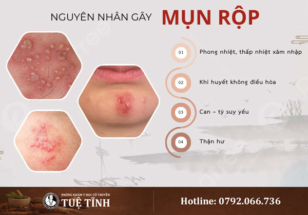 Mụn rộp là tình trạng da xuất hiện các mụn nước nhỏ li ti hoặc thành cụm, thường kèm theo đau rát, ngứa ngáy, thậm chí loét và gây khó chịu kéo dài. Theo Đông y, mụn rộp hình thành khi cơ thể mất cân bằng âm dương, khí huyết rối loạn, tạng phủ suy yếu, đồng thời bị phong – thấp – nhiệt xâm nhập.