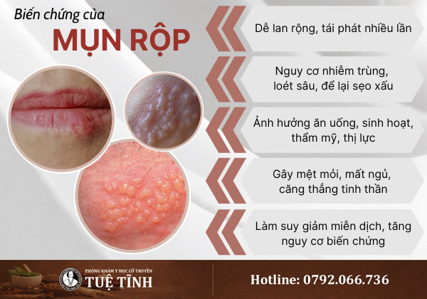 ➦ Mụn rộp vỡ ra dễ gây nhiễm trùng, loét sâu, để lại thâm sạm hoặc sẹo xấu.